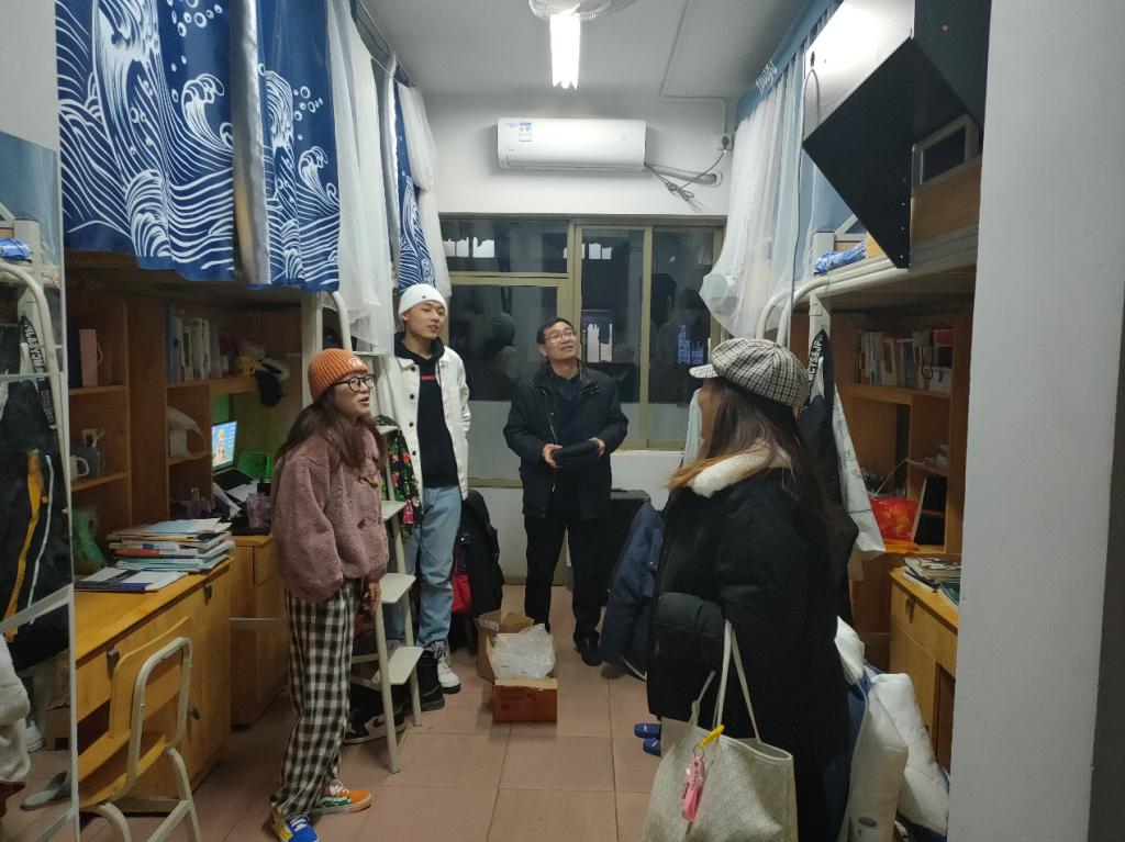 每到一间宿舍,老师们详细了解学生学习、生活和家庭情况,与同学们亲切交谈。魏桃初代表学院向学生们提前致以新年的问候,并亲切地询问:“老家是哪里的?和家人通电话没有?”嘱咐同学们有任何困难及时联系老师。李敏强调了几点注意事项:一是提高宿舍消防安全意识,做到人走关电、不使用违规电器;二是保持宿舍卫生的整洁;三是临近期末,要认真备考。同时近日气温降低,李老师贴心地提醒同学们注意保暖。