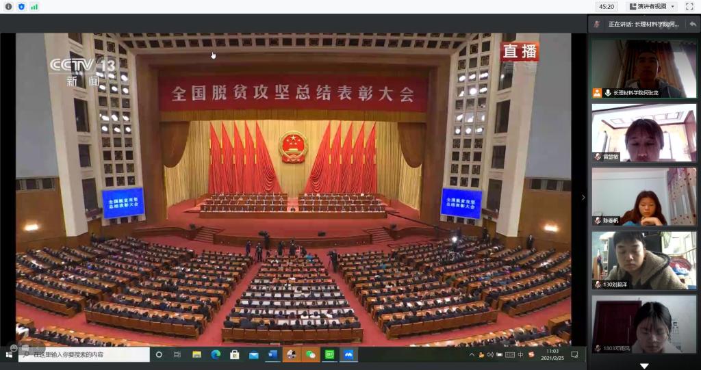 2月25日10:00,全国脱贫攻坚总结表彰大会在北京人民大会堂隆重举行,材料学院学生党支部通过腾讯会议组织进行线上集中观看,研、本全体学生党员收看直播。