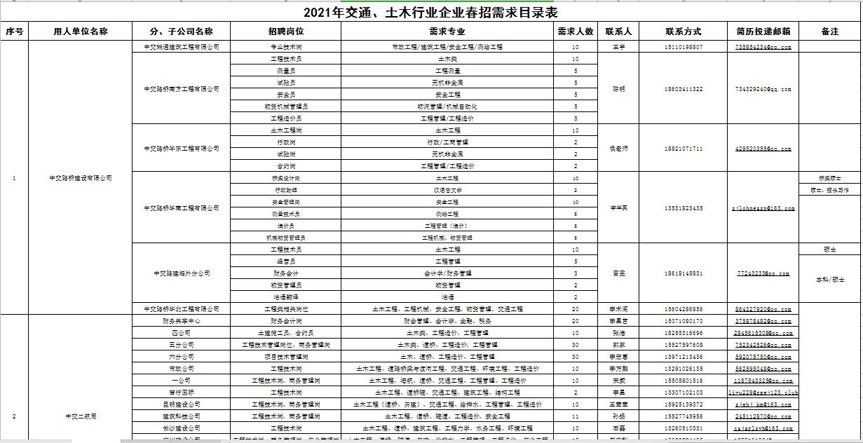 临近开学,学校2021年春季校园招聘工作即将全面启动。为统筹抓好疫情防控和“稳就业”“保就业”工作,促进毕业生充分高质量就业,实现校园春招“开门红”,交通学院特地为全体待就业毕业生准备了开学“定制就业服务礼包”,并于2月24日发布了2021年交通、土木行业企业春招需求目录表。