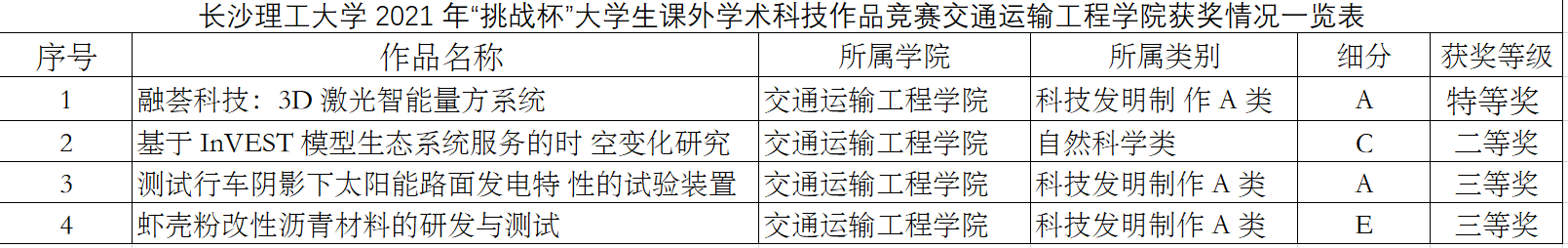 3月23日下午,永利官网于云塘校区图书馆东侧举办2021年“挑战杯”大学生课外学术科技作品竞赛。交通学院《融荟科技:3D激光智能量方系统》项目在徐鹏和汪招霞老师的指导下获得特等奖;《基于 InVEST 模型生态系统服务的时空变化研究》项目在丁美青和夏清老师的指导下获得二等奖;《小龙虾壳粉改性沥青》项目在吕松涛和彭笠老师的指导下获得三等奖;《一种测试行车阴影下太阳能路面发电特性的试验装置及其方法》项目在查旭东老师的指导下获得三等奖。