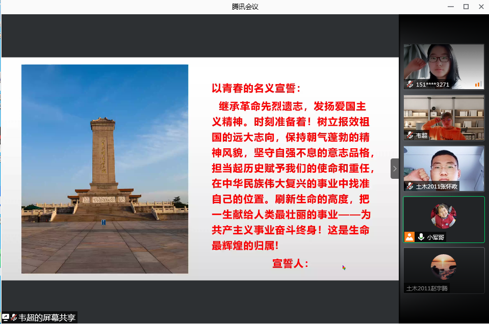 “我以青春的名义宣誓:继承革命先烈的遗志,发扬爱国主义精神。时刻准备着!树立报效祖国的远大志向,保持朝气蓬勃的精神风貌……为共产主义事业奋斗终生!这是生命最辉煌的归属!” 4月5日,在中华英烈网上,永利官网土木学院入党积极分子们庄严宣誓。
