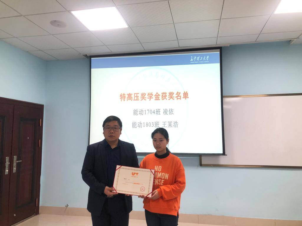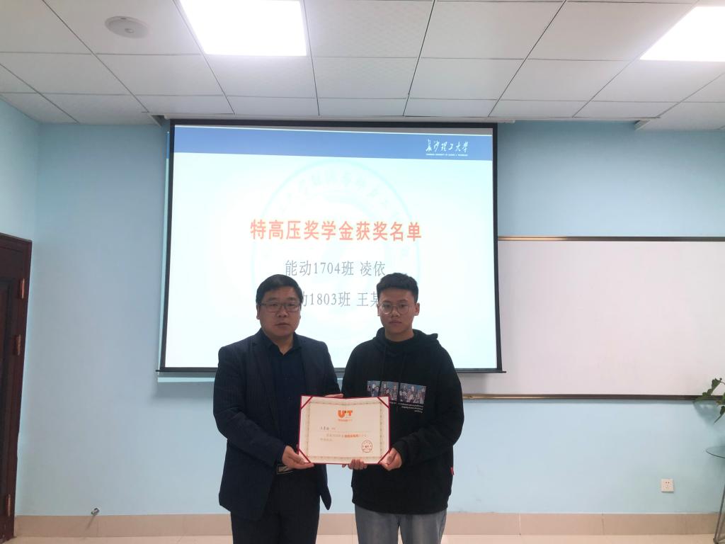 靳攀科为获奖的两位同学颁发了获奖证书并合影留念。他表示,长期以来国家电网公司等电力行业企业为国家经济建设和社会发展作出了突出贡献。特高压电网奖学金作为全国首个能源行业奖学基金,是电力行业发挥自身优势支持教育事业的实际行动,是促进行业协同、校企合作的积极作为,能动学院将继续积极发挥学科和人才优势,努力为电力行业的发展贡献力量。