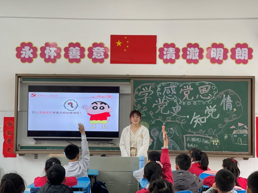 “小朋友们认不认识这个图案呀?”“没错,这是中国共产党党徽,它是由镰刀和锤头组成的,你们想不想自己动手来做一个党徽呢?”“想!”近日,化学学院学生党员组织的“学党史,知党情,感党恩”主题宣讲活动在芙蓉区东风小学如火如荼地开展。