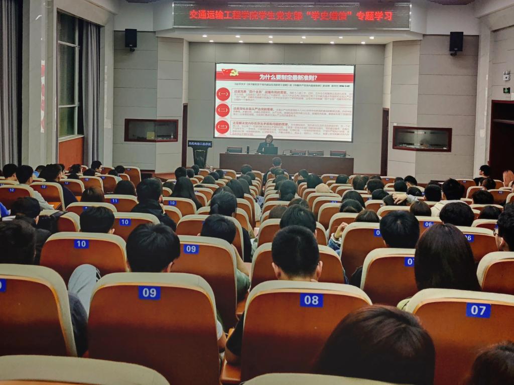 4月21日晚,交通学院在工二科技报告厅开展“学史增信,坚定信仰担使命”党史专题学习活动,学院党委书记孔伟红为主讲人,党委副书记王煜坤、学生党建辅导员肖敏强出席,全体本科生党员参加。