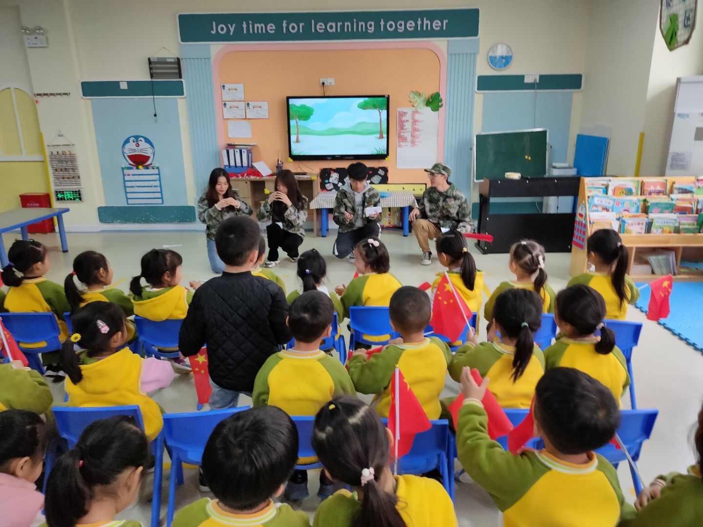 “国旗国旗真美丽,烈士鲜血染红你。国旗国旗我爱你,光明照亮黑土地。国旗国旗飘扬起,五星团结在一起。我向国旗敬个礼,心中永远飘着你”活动中,宣讲员带着孩子们朗读《国旗国旗我爱你》,小朋友们动情地拿着小红旗挥舞,用最真诚的方式表达破土萌动的爱国之情。