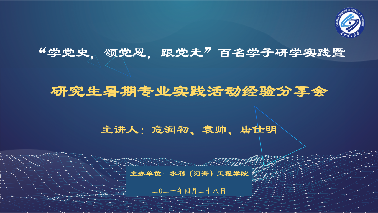 4月28日晚,水利学院在工三B446举行了“学党史,颂党恩,跟党走”百名学子研学实践暨研究生暑期专业实践活动经验分享会。分享会由学院水文系专业教师危润初、往期暑期专业实践活动获奖团队代表19级博士生袁帅、18级硕士生唐仕明担任主讲,研究生辅导员綦丽、部分研究生和本科生参加了此次活动。会议由20级班长杨恩喆主持。