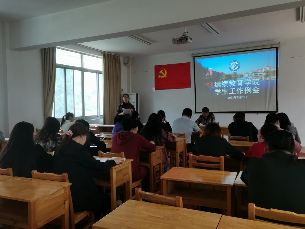 4月29日下午,继续教育学院在15教402组织召开了学生工作会议,学院党总支副书记兼副院长方碧波、学工部主任刘卓明、学工部老师及校企合作部的全体班主任参加。
