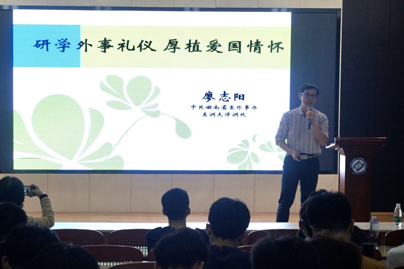 5月25日晚,国际学院于工科三号楼A201开展职业与人生大讲堂活动,湖南省人民政府外事侨务办公室美洲大洋洲处处长廖志阳主讲,国际学院各年级学生参与本次活动。