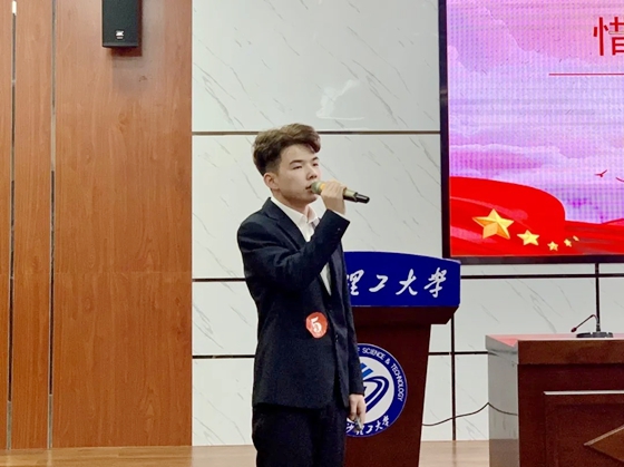 经济管理系3号选手昂首挺胸,自信地在台前讲述:回眸历史长河,要弘扬革命传统,担当起强国复兴的使命;要汲取历史教训,贡献出自己的一份力量。