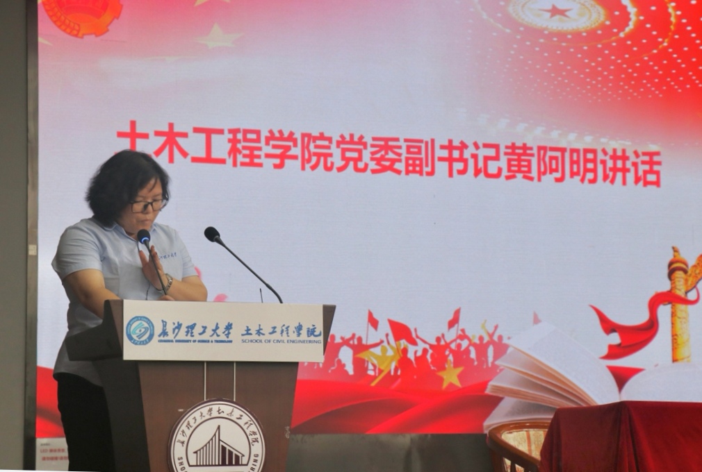 黄阿明在讲话中提出“荣誉至上,只争第一”,希望同学们具有高度荣誉感和责任心,在工作中团结一心,只争第一,让长理校园中充满土木人的声音。