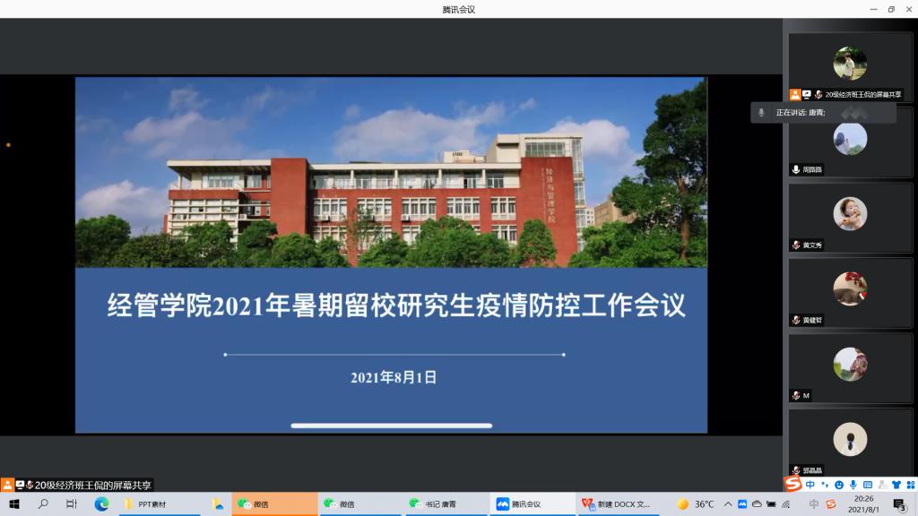 8月1日晚,经管学院使用腾讯会议分别为留校研究生和本科生召开暑期留校学生疫情防控工作会议。院党委副书记唐青、全体辅导员和留校学生参加。