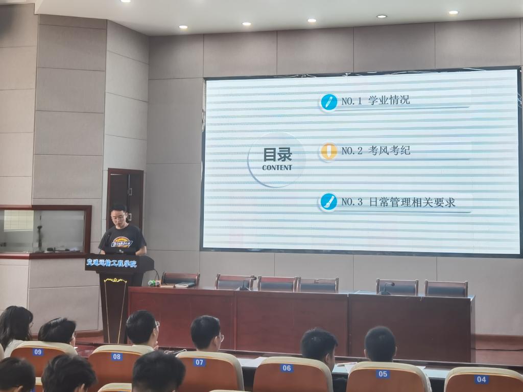 随后,曹骁对2018级上一学年的学业情况进行了分析,提醒各专业同学认真对待学业,牢记《本科生学习指南》毕业要求,关注学分情况,及时解决学业困难;他还强调了考风考纪与日常管理的相关要求,呼吁学生积极配合养成教育与劳动教育工作,养成良好的生活习惯,熟读《学生手册》,严格遵守各项规章制度。曾凯针对2018级学生进行了就业动员与指导,介绍了往届学生的就业考研情况、目前行业领域的就业形势、就业注意事项,指导学生进行求职简历编写、云平台网络签约等,并对优秀校友的工作事迹进行了分享。