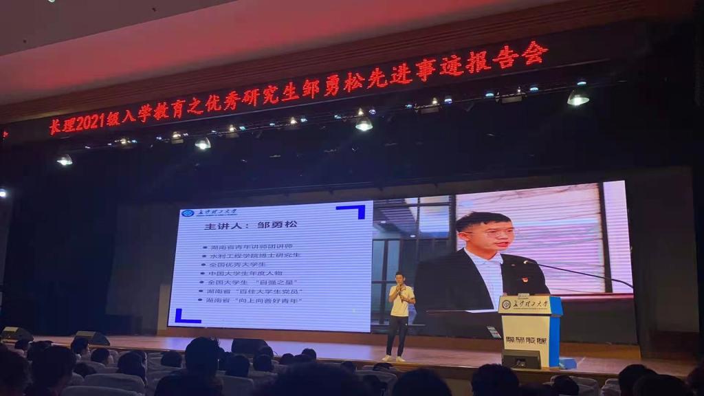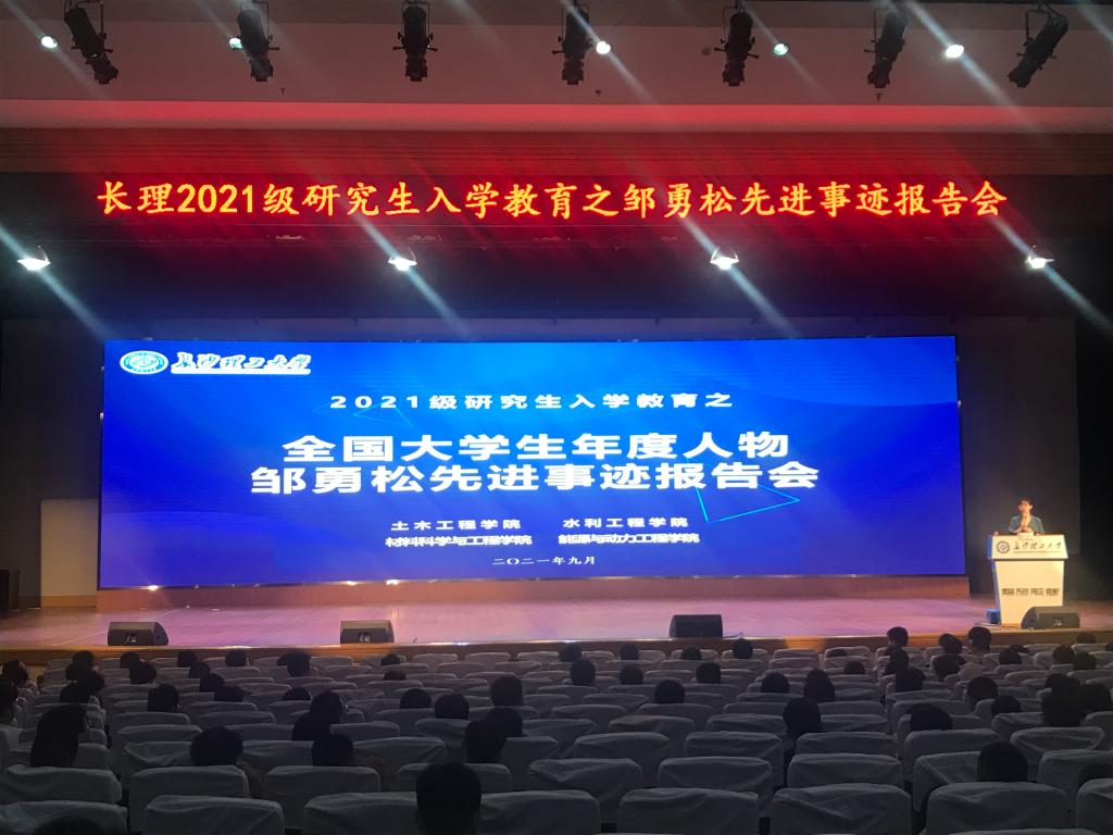 为进一步发挥研究生榜样的引领示范作用,落实研究生院下发的《关于做好2021级研究生入学教育工作的通知》的文件精神,9月13日,土木工程学院联合四个学院在金盆岭校区5教大礼堂举行2021级研究生入学教育之优秀研究生邹勇松先进事迹报告会。水利工程学院2019级博士研究生、全国大学生年度人物邹勇松主讲,土木学院研究生辅导员李小军,水利学院研究生辅导员杜丘及土木、水利、能动以及材料学院600余名研究生新生参加报告会。