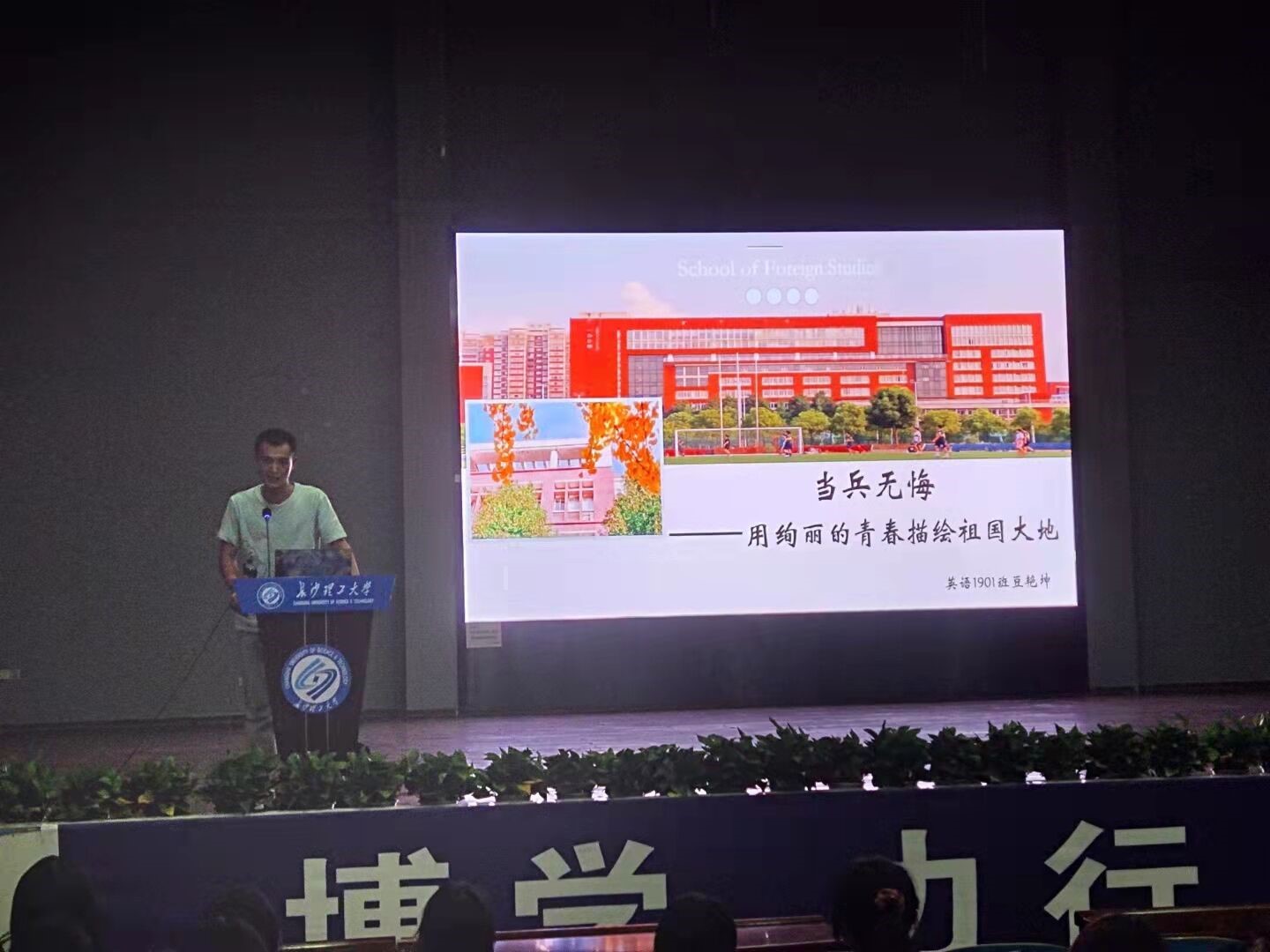 其次,英语1901班豆艳坤同学向同学们讲述了他在部队的经历,其中让他印象最深刻的是九江抗洪,同时他还鼓励想参军入伍的同学积极参军入伍,不怕困难,不留遗憾。