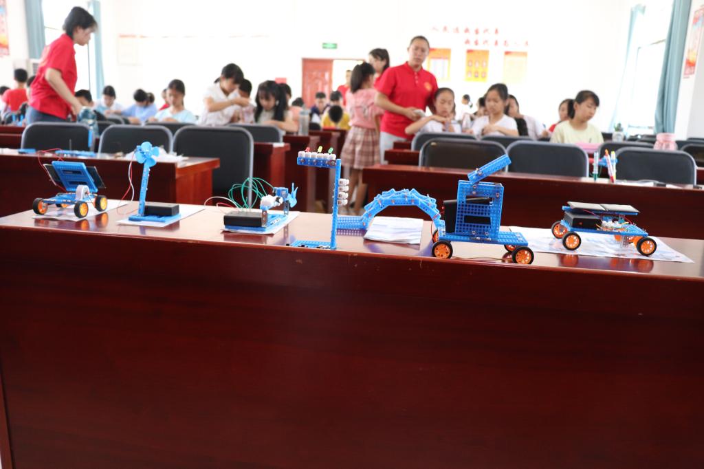 赵斌、石尔两位老师为孩子们带来科学实验课。在讲解了有趣的能源知识:能量如何转换,电从哪里来,生活中的离心现象。演示了实验仪器的操作后,孩子们两人一组开始动手制作自己的物理实验模型。科学实验重在启发孩子的独立思维和动手创造能力,石尔老师也强调“孩子们自己动手是最重要的,参照图纸协同完成,遇到解决不了的问题再询问老师。”模拟风力发电机、光伏驱动小车、双驱风力小车……看似遥远的科技简易模型通过激烈的讨论与分工合作在孩子们手中诞生。