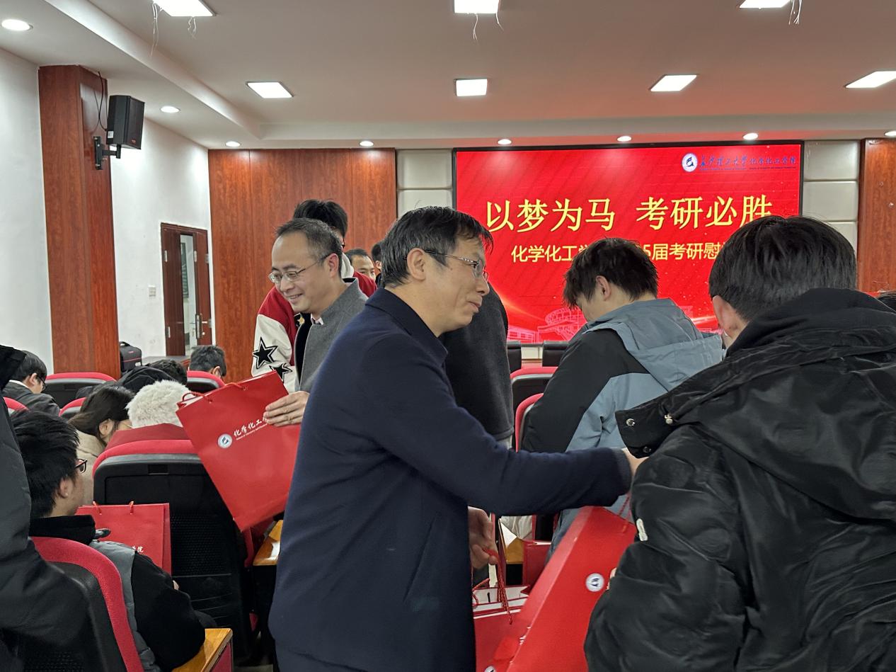 活动前,学院为每位考研的学生精心准备了礼物,表达学院对广大学子们的深深祝福与殷切期盼,在校的低年级学生也在明信片上写下了对即将参加考试的学长学姐们的祝福语。宋刘斌深情的寄语学生积极应对考试、端正心态、奋力冲刺。同时,他也叮嘱大家要合理安排时间,注意劳逸结合,保持良好的心态应对考试。他表示,学院会成为每一位同学坚实的后盾,帮助同学们克服困难、解决问题。在活动的最后,出席活动的院领导将礼物送到每一位学生的手中,预祝他们考研必胜。