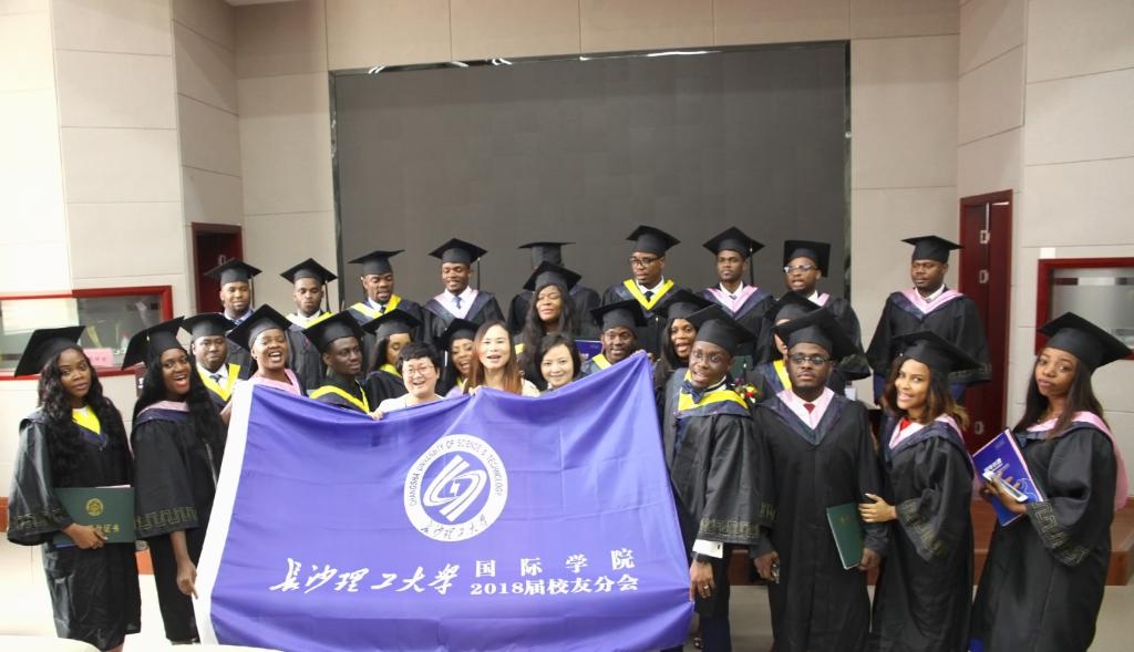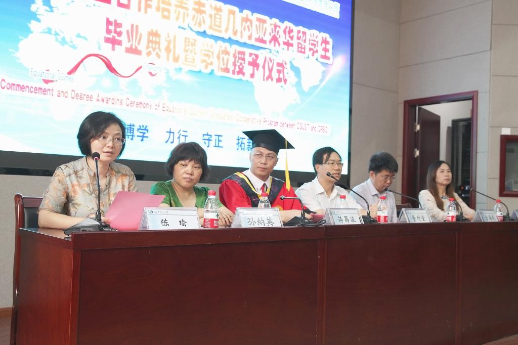 7月12日上午,2018届赤道几内亚来华留学生毕业典礼暨学位授予仪式在云塘校区工二B区多功能厅隆重举行。副校长蒋昌波,校党委委员兼国际学院党委书记付嫦娥,国际交流处处长吴迪龙、校友中心副主任郑延恒、土木工程学院副院长陈伏彬、经济与管理学院副院长谢朝华,留学生资助方中国路桥工程有限责任公司董事、总会计师董付堂、人力资源部副总经理宫海龙、人力资源部许囡、国际化人才培养实习基地湖南路桥建设集团有限责任公司工会主席孙纳英、人力资源部副部长陈新伟出席,以及国际学院国际学生工作办公室全体老师、2018届赤道几内亚毕业生的亲朋好友、黑山孔子学院到永利官网参加夏令营的全体营员等参加了典礼。毕业典礼由国际学院院长陈瑜主持。