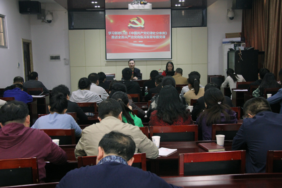 胡秀英以《用铁的纪律推动全面从严治党向纵深发展——学习贯彻新修订的<中国共产党纪律处分条例>》为题,结合学校和继教院工作实际,为党员同志们解读了新修订的《中国共产党纪律处分条例》。她简要介绍了《条例》修订的基本情况和背景意义,从一个思想、两个坚决维护、三个重点、四个意识和四种形态、五处纪法衔接、六个从严、七个有之、八种典型违纪行为等八个方面,阐释了新《条例》的八大亮点。她运用大量生动案例,为大家划出45条纪律底线。她强调,全体党员都要深入学习好、全面遵守好和严格执行好新条例。