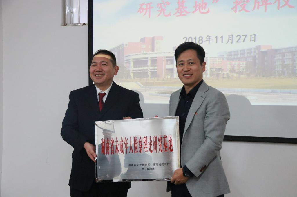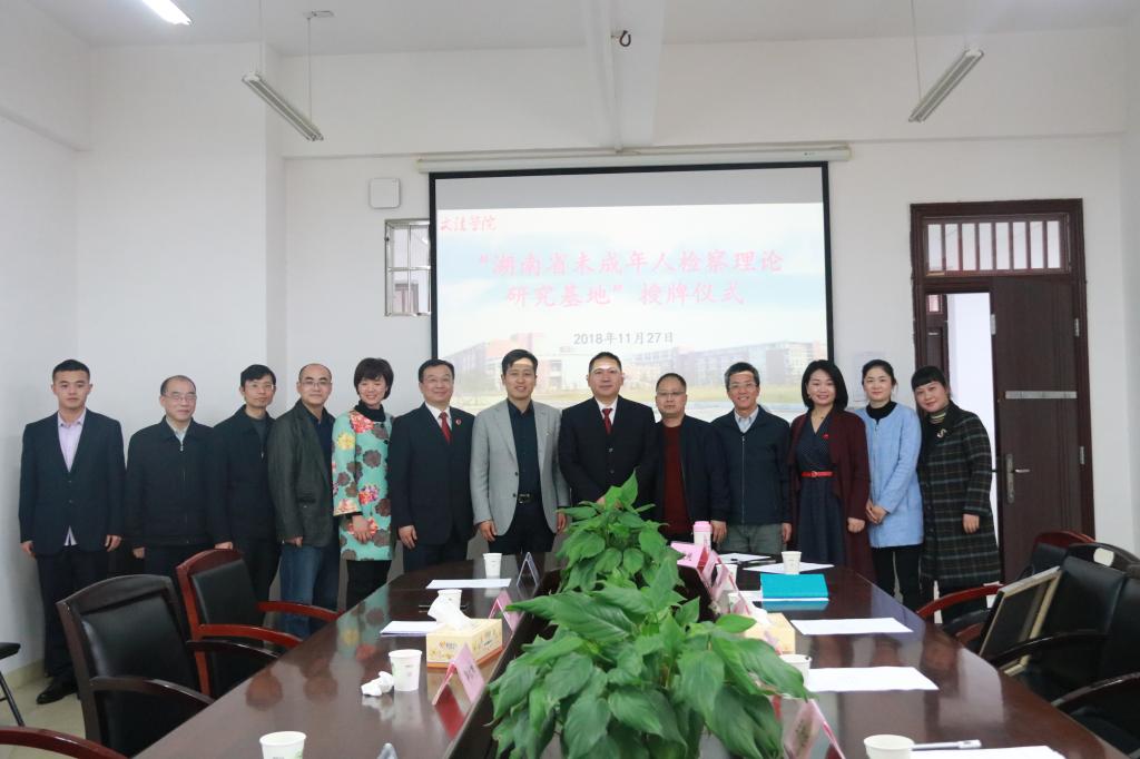11月27日下午,湖南省人民检察院副检察长印仕柏、公诉一处副处长梁驭骁莅临yl7703永利官网文法学院,代表湖南省人民检察院为“湖南省未成年人检察理论研究基地”授牌。副校长刘扬、人文社科处处长卿定文、文法学院院长王新生、文法学院党委书记孔伟红等领导以及理论研究基地的部分老师出席了活动。