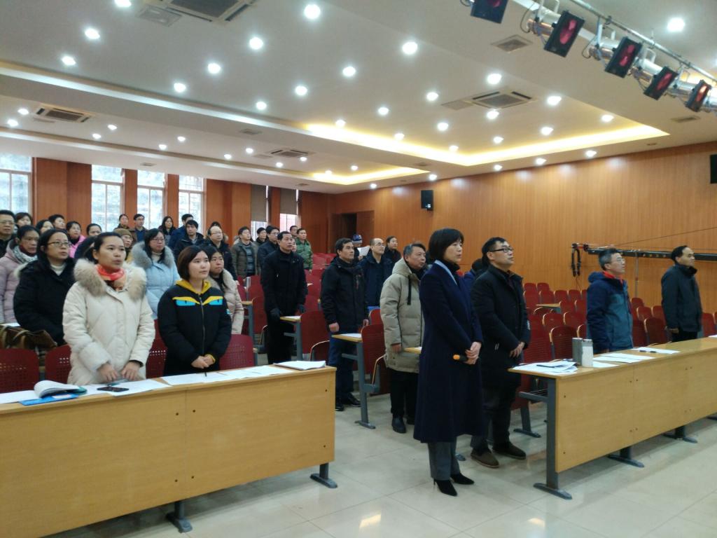 会议在雄壮的国歌声中拉开帷幕。院长王新生首先向全体教员作了行政工作报告。王新生分别就师资队伍建设、学科建设与发展、科学研究、人才培养、师生国际交流与合作、学生管理工作等方面工作进行了全面的总结。盘点过去的一年,文法学院全体老师踏着坚实的步伐,向着既定的目标奋勇前进。有不足、有总结、有反思、更多的是进步,而这一切离不开每一位老师的辛勤付出。王新生在报告中还对2019年学院的工作重点进行部署和展望。