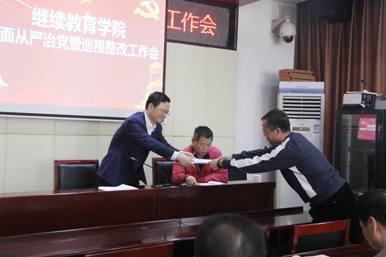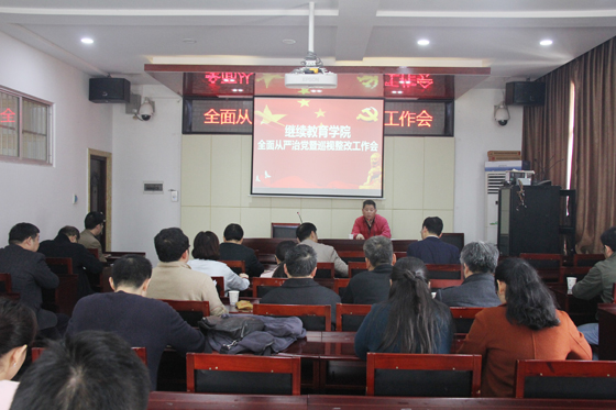3月29日下午,继教学院召开全面从严治党暨巡视整改工作会议。院领导班子成员、全体教职工党员和非党员部门主任参加会议。院党总支书记何纯芳、院长颜鲜明讲话。副书记兼副院长方碧波主持。