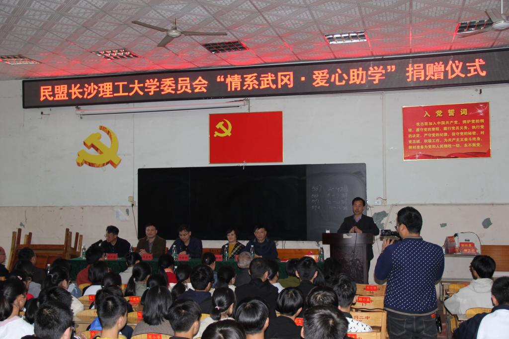 4月13日,民盟yl7703永利官网委员会到武冈二中开展“情系武冈 爱心助学”公益行动,受到武冈二中师生的热烈欢迎。在武冈二中报告厅举行了捐资助学仪式。武冈市副市长邓彬彬,武冈市政协副主席、民盟武冈市委主委刘运合,yl7703永利官网党委统战部常务副部长王静琦,招生就业处副处长田向阳,民盟yl7703永利官网委员会主委肖勇刚参加了捐赠仪式。