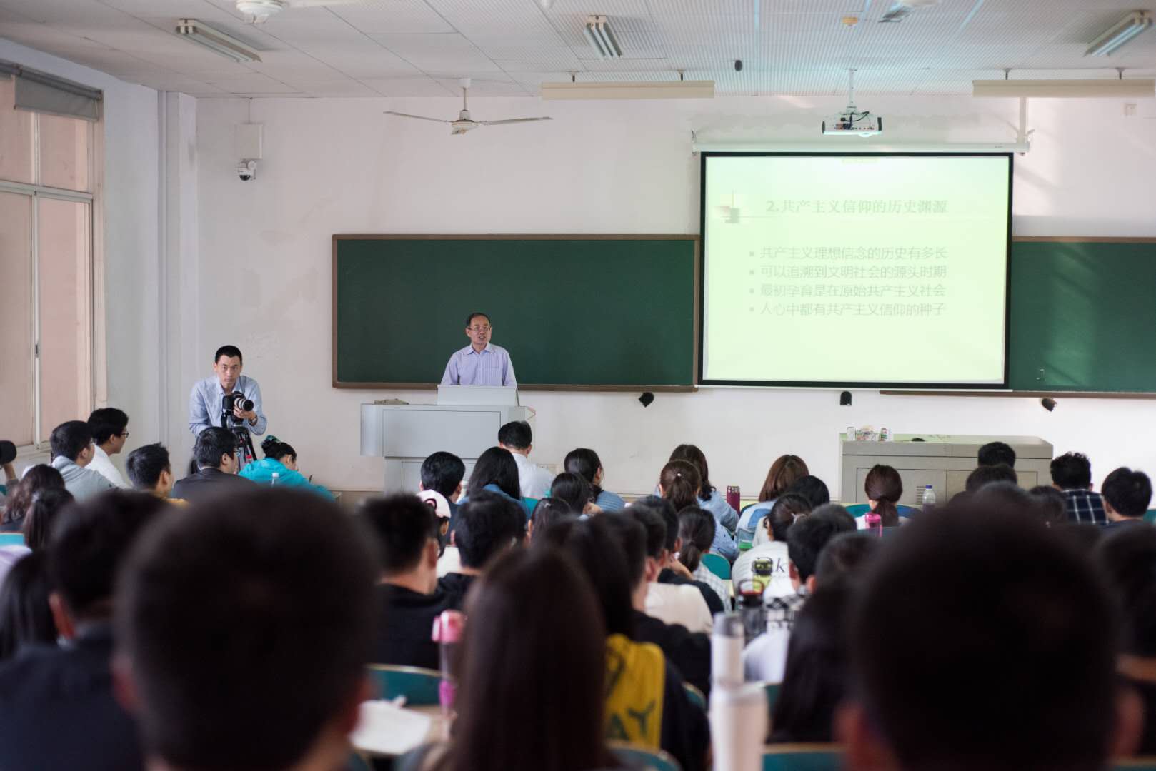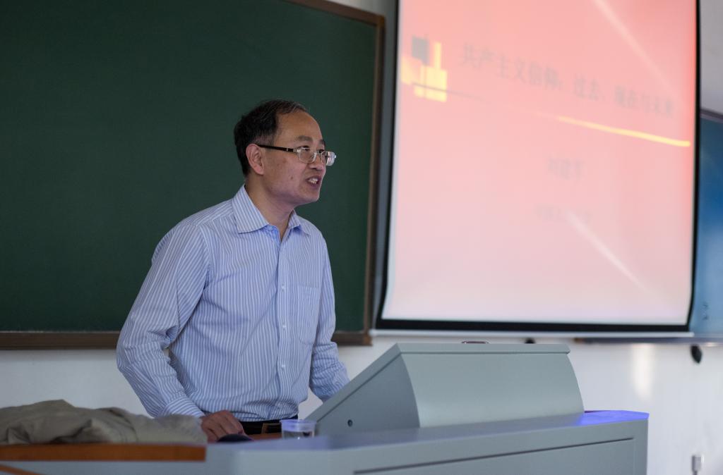 本次课堂作为开放式课堂的最后一课,刘建军教授以“共产主义信仰:过去、现在与未来”为主题,上了示范性的精彩一课。他分别从共产主义信仰的由来、共产主义信仰的历史渊源、共产主义信仰的历史过程、共产主义信仰的基本内容和共产主义信仰体系这五个方面讲述共产主义的信仰,深入浅出,层层递进、逻辑严密。最后,形象地用画图描述了共产主义信仰体系的两个焦点,并用一句话 “中国共产党人全心全意为人民服务,不惜牺牲个人的一切,为实现共产主义奋斗终身”把两个焦点串联起来。课堂结束,在座师生响起了热烈的掌声。