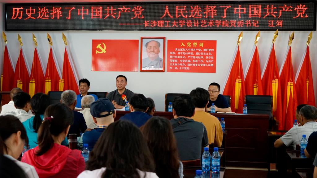 在枧杆山村的文化大礼堂,江河以高度的理论深度与清晰的逻辑脉络,为学院教工党员及枧杆村全体党员上了一堂生动的“历史选择了中国共产党,人民选择了中国共产党”的党课。他强调,无论何时何地,我们都应该保持初心,牢记使命,敢于担当,积极作为,不负一名中国共产党员的责任与称号。
