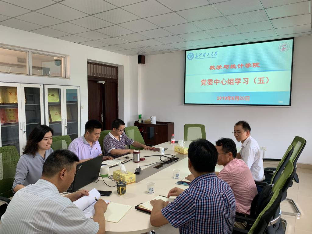 6月20日上午,数统学院党委在理科楼A506进行中心组学习,党委委员、院领导班子成员参加学习,党委书记张宏伟主持,本次主讲人党委副书记马丽。