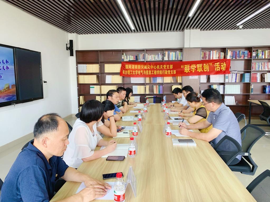 9月12日下午,国网湖南防灾减灾中心机关党支部成员在支部书记陈如玉带领下,来校与学院行政党支部开展“联学联创”第一次主题党日活动。活动在学院教师发展中心进行,由行政党支部书记周卓主持,行政党支部全体支委和党员代表参加。