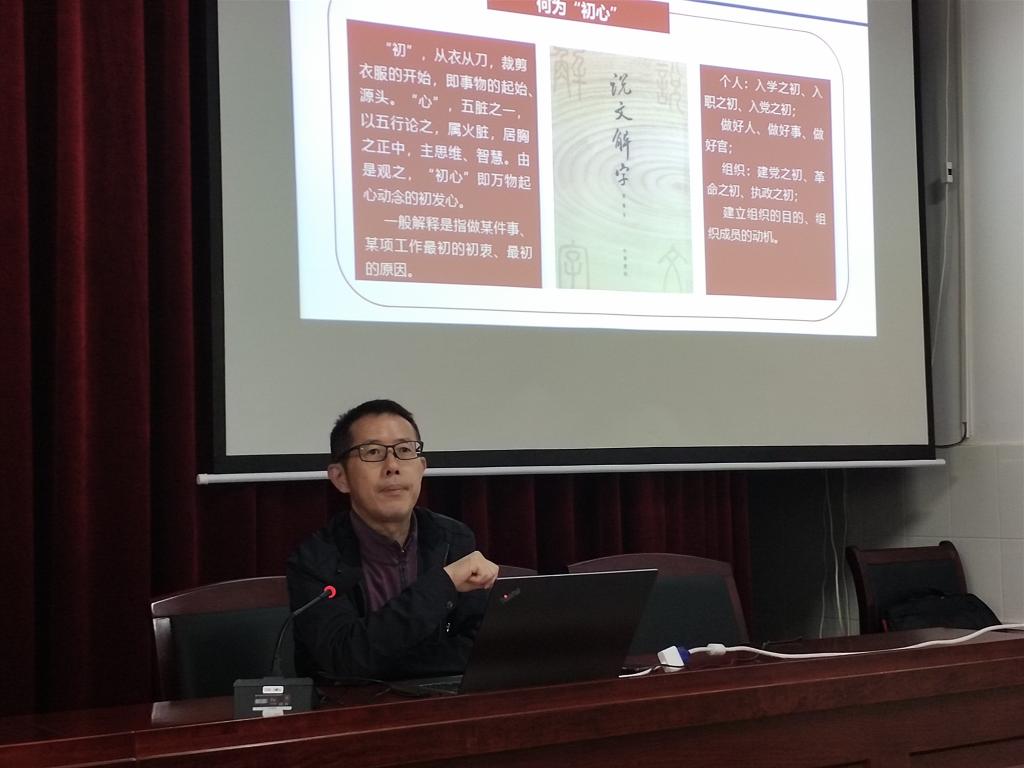 10月29日下午,在学院报告厅,学院党委书记丁力以“始终牢记中国共产党人的初心和使命”为题,给全院教工党员及学生党员上主题教育专题党课。
