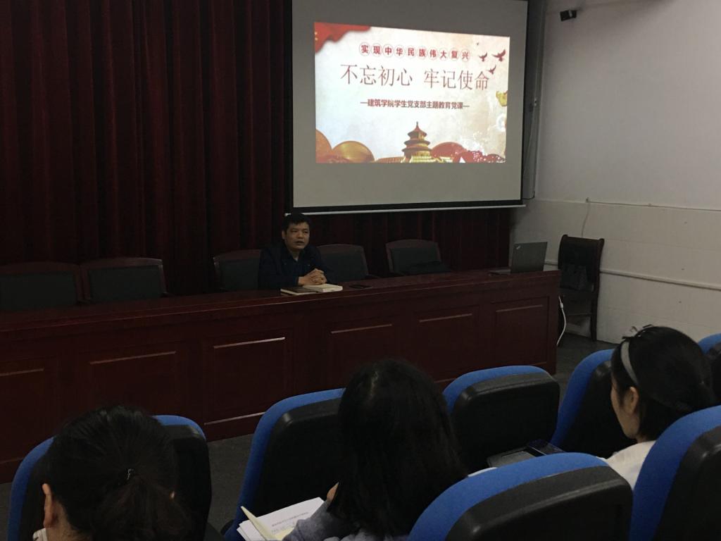 许建和副院长给建筑系支部讲授党课的主题是“践行教师的初心使命,推进教育教学改革”,他从严格教育教学管理、深化教育教学制度改革、引导教师潜心育人、加强组织保障四个方面阐述了本科教育教学改革目的、意义及途径。