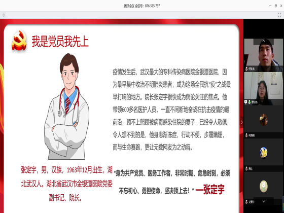 3月4日,学生党支部依托“腾讯会议”平台视频会议召开了线上专题组织生活会。全体党员共同观看了战“疫”感人视频,纷纷向战斗在一线的医护工作者、人民子弟兵等最美逆行者致敬,学习了《习近平总书记在统筹推进新冠肺炎疫情防控和经济社会发展工作部署》等重要指示批示精神,以及“教育部致全国大学生的一封信”等内容,从疫情发生以来联防联控的成效解读了中国制度的显著优势,分享了关于中国精神、中国力量的理解。在支部成员交流感悟环节,进行了《一名党员、一面旗帜》的主题分享,引申了雷锋精神及其现实意义,对疫情下的雷锋精神进行了详细介绍,并表示要以实际行动丰富新时代雷锋精神的内涵。最后,全体党员诵读“停课不停学,党员做表率”倡议书。