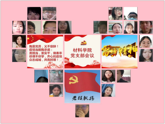 为坚决贯彻落实习近平总书记对新型冠状病毒肺炎疫情的重要指示精神,充分发挥特殊时期材料学院党总支战斗堡垒作用和党员先锋模范带头作用,号召学院全体党员不忘初心、牢记使命,落实好立德树人根本任务,全力以赴保障疫情防控期间学院工作的有序高效运行,全面助力打赢疫情防控阻击战,根据学校《关于在基层党支部召开“齐心战‘疫’、党旗飘扬”线上专题组织生活会的通知》精神和要求,材料学院各党支部在本周陆续召开了“齐心战‘疫’,党旗飘扬”线上专题组织生活会,会议由各支部书记主持,全体教工党员及学生党员均参加了线上视频会议。