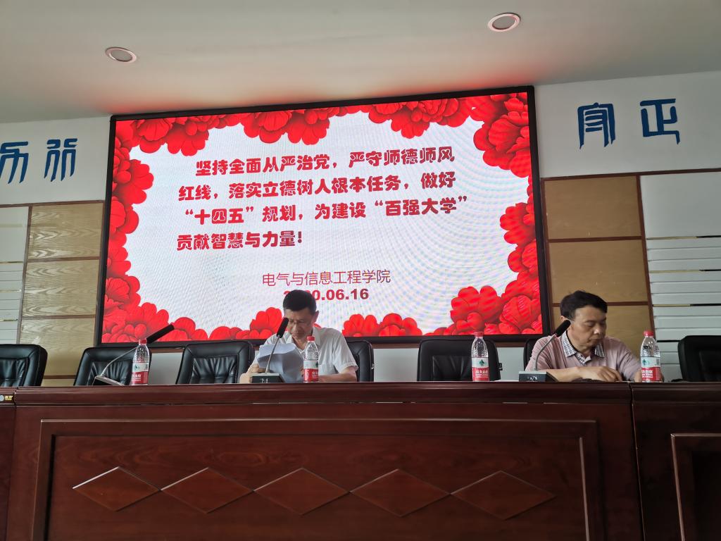 6月16日下午,电气学院党委召开全面从严治党与师德师风建设大会。会议主要学习了十九届中央纪委四次全会、省十一届纪委五次全会精神,传达了学校全面从严治党工作会议精神,对2020年工作提出了要求。学院领导班子成员,全院教职工参加,会议由学院党委书记符慧林主持。