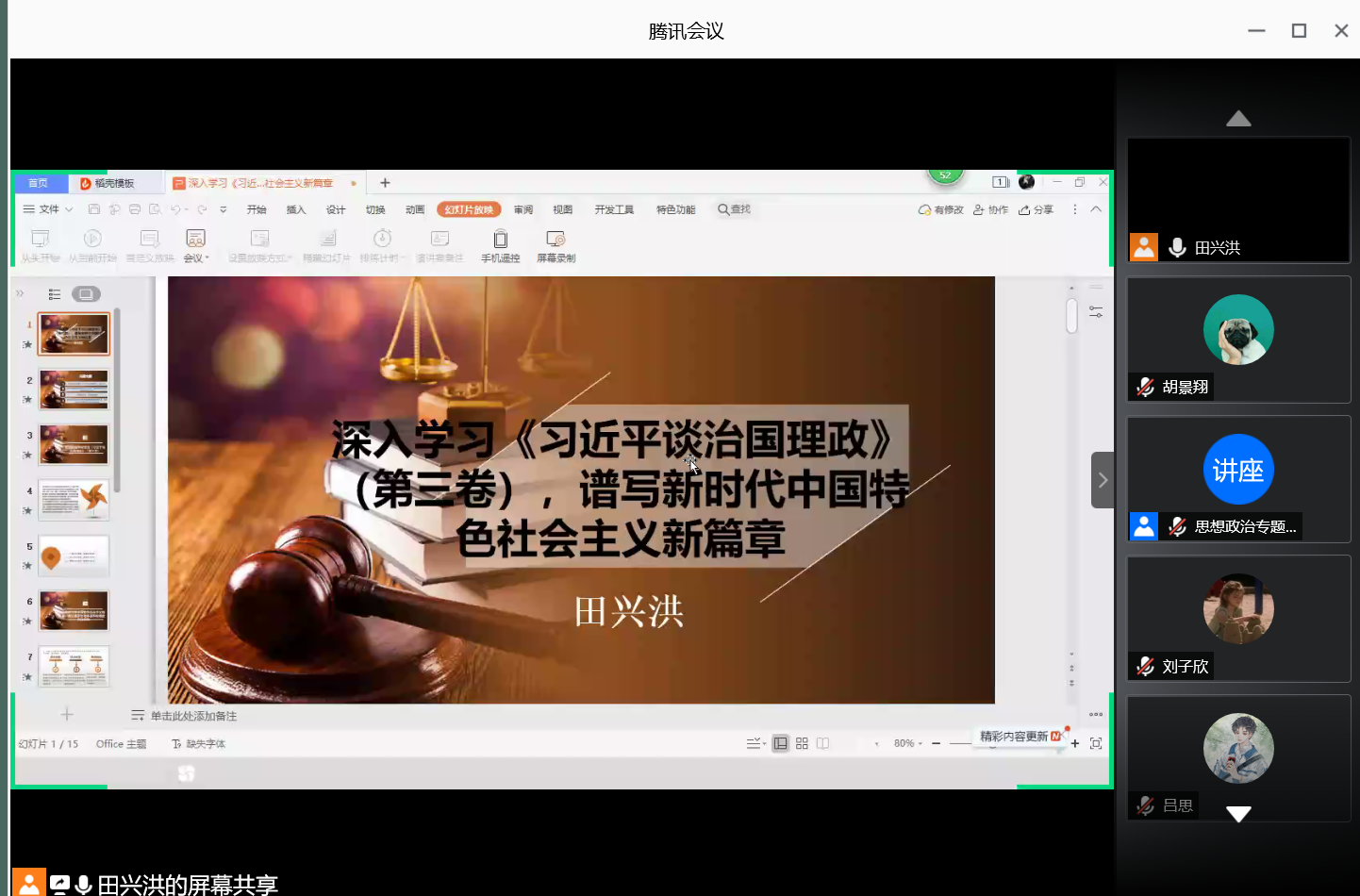 9月17日晚,法学系在腾讯会议线上进行《习近平谈治国理政》(第三卷)专题党课学习,法学系全体教职工、全系学生党员、入党积极分子参加全体成员参加。专题党课由党总支书记田兴洪主讲。