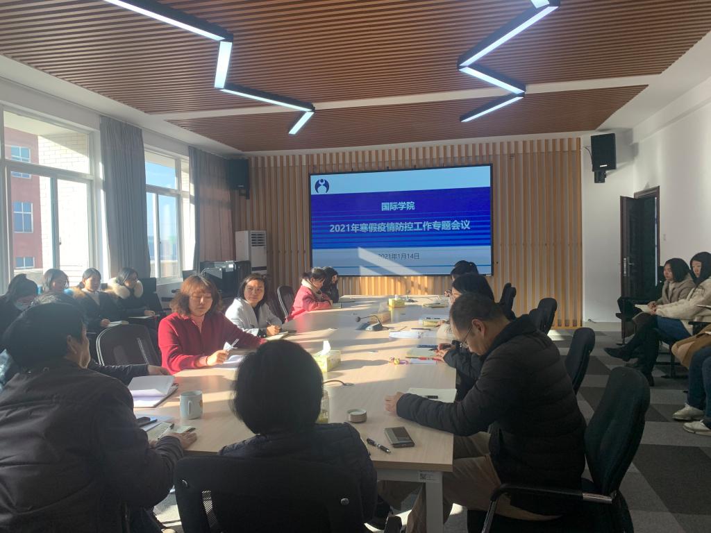 为贯彻落实学校疫情防控工作会议精神,切实抓好假期疫情防控工作,充分保障师生生命安全,国际学院于1月14日上午组织全体教职工召开2021年寒假疫情防控工作专题会议。院党总支书记刘安生主持会议。