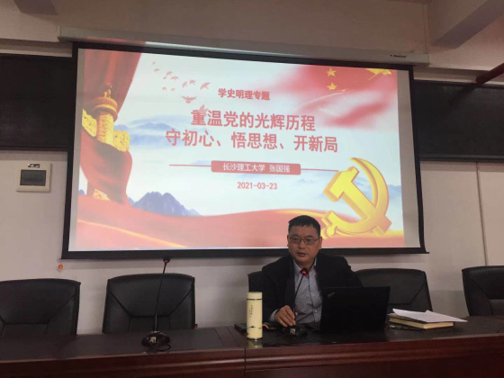 张国强在党课中结合习近平总书记在党史学习教育动员大会上的重要讲话精神,以及校党委书记付宏渊在学校党史学习教育启动仪式上的讲话精神,以“探索救国救民之路”“立制建国兴国之路”“改革开放富国之路”“改革开放强国之路”四个阶段为时间轴向师生党员们讲述了党的百年光辉历程,带领大家共同“学党史、悟思想”,重温党的光辉历程,进一步坚定了党员们感党恩、听党话、跟党走的信心和决心。