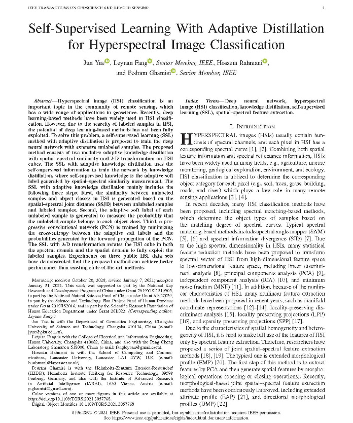 Jun Yue, Leyuan Fang, Hossein Rahmani and Pedram Ghamisi, "Self-Supervised Learning With Adaptive Distillation for Hyperspectral Image Classification," in IEEE Transactions on Geoscience and Remote Sensing, doi: 10.1109/TGRS.2021.3057768。
