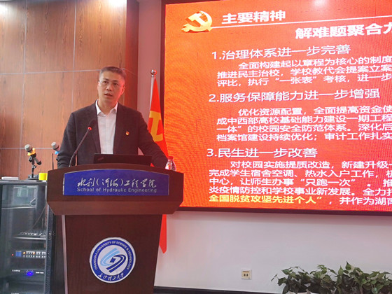 4月27日下午,校党委副书记蒋昌波在工三B319为水利学院全体教职工开展中国共产党yl7703永利官网第四次代表大会精神宣讲,学院党委书记喻玲娜主持。