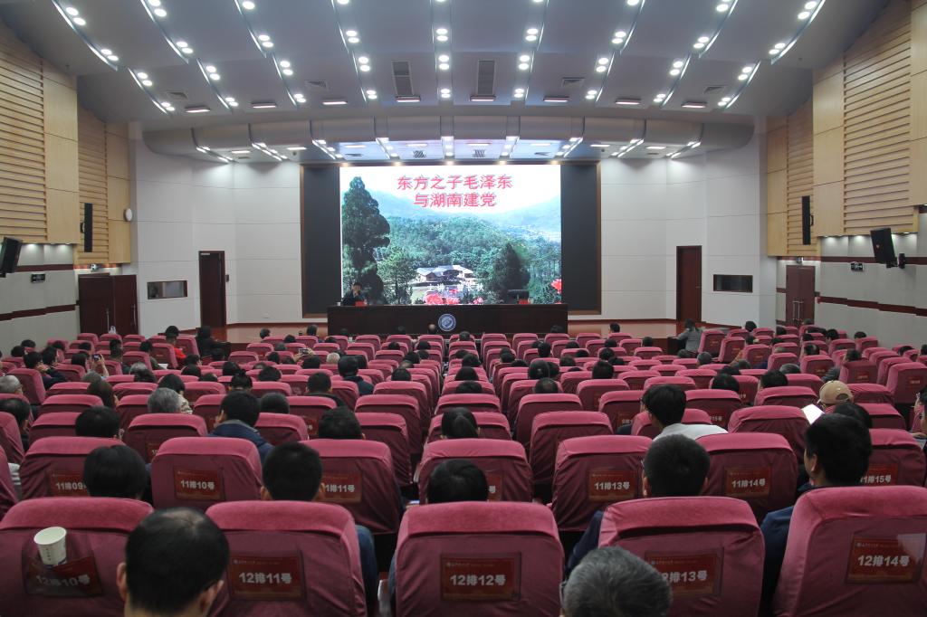 曾长秋以“东方之子毛泽东与湖南建党”为主题,围绕毛泽东早期的学习及革命生涯和他早期在湖南建党中发挥的重要作用两个方面展开。他围绕“一个人和一件事”,重点介绍毛泽东同志的生平和思想,阐述毛泽东思想产生的条件、历史发展、科学体系及其灵魂。此外,他引用毛泽东同志在湖南建党历程中发挥的重要作用,和在场师生一起讨论这一时期的湖南建党历史对毛泽东思想形成的重要作用。曾教授幽默风趣的演讲形式,让在场师生如沐春风,现场气氛十分热烈。