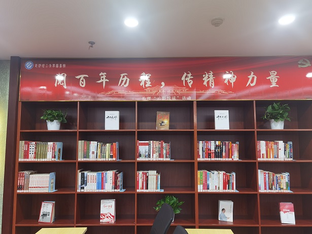 走进云影文化传播中心,首先看到的是“阅百年精神,传精神力量”的书展,两边的书架摆上了近500本党史书籍,希望通过阅读红色经典书籍,进一步了解党的历史,感受党的成长历程。后面是红色的四块展板,分别是“百年百书”“百年百诗”“百年百影”“百年百歌”的目录。每周二云影文化传播中心播放红色电影供读者赏阅,穿梭在百部电影浓缩的百年党史中,伴着百部红曲中的九曲回肠,触及党的初心与信仰,并牢记于心,目前已播放《建党伟业》等2场红色电影。同时联合教职工朗诵协会与第四届“朗读者”比赛获奖选手,邀请爱好朗读的朋友们朗诵配音,朗读红色诗歌,每周三由图书馆微信公众号发布。通过红色阅读“四百”活动将图书馆云影文化传播中心打造成面向全校师生的党史学习专区。