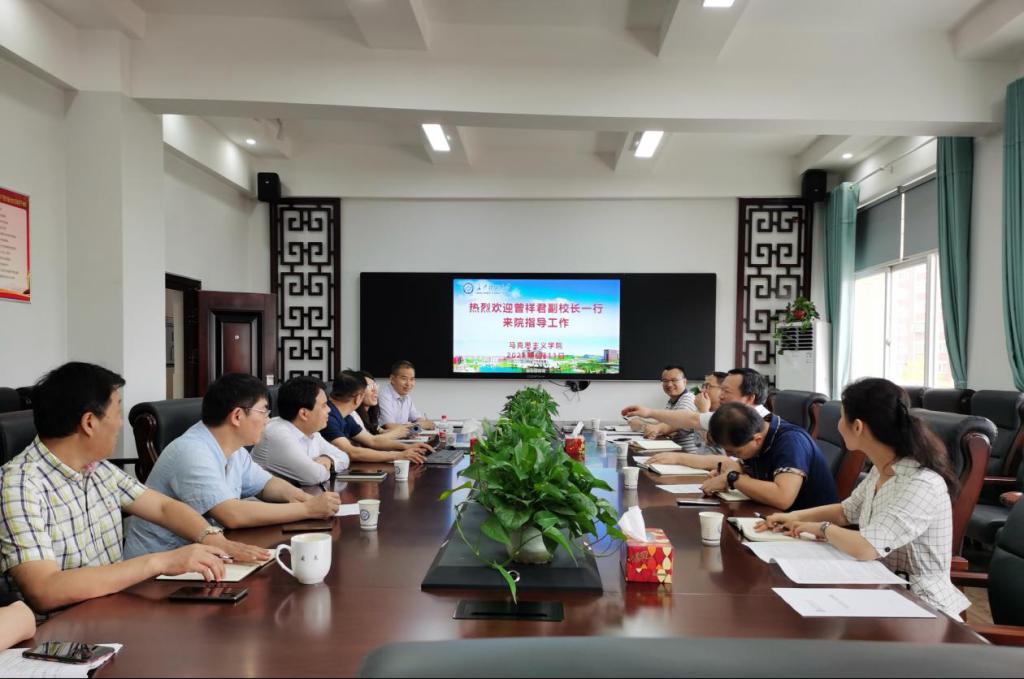 6月11日上午,副校长曾祥君、科研部部长王进、社科处处长刘建江、成果转化服务中心副处长刘亚辉、社科处胡滨一行5人来到马克思主义学院指导学院工作。马克思主义学院党委书记易显飞、院长陈万球,副院长张明海、李雨燕、郭华、周展组织员,教授委员会主任余乃忠等参加会议。
