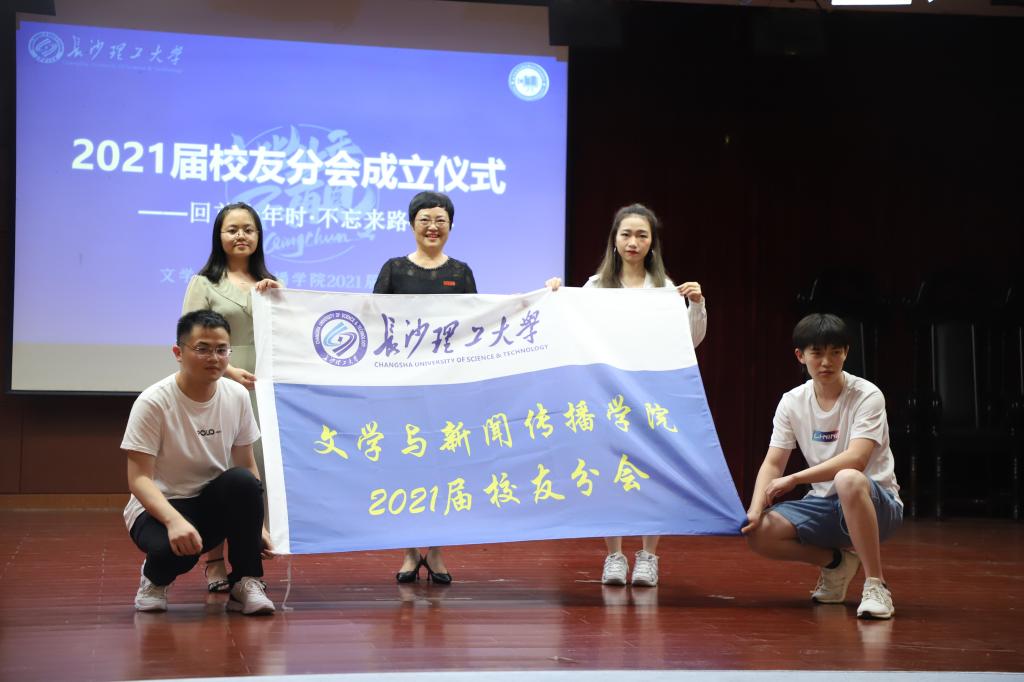 王静琦为文新学院2021届校友分会授旗。学生王舒琦、张雨豪、叶婷、杨诗峻上台接旗。