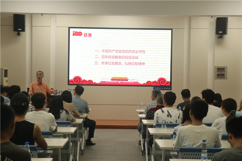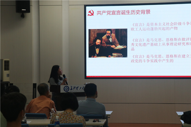 张可荣老师以《从创党历史中汲取青春力量》为题,从中国共产党诞生的历史必然性、“觉醒者”的创党活动、如何传承红色基因三个方面进行阐述。他指出中共一大参与者平均年龄20多岁,创党党员中湖南籍占三分之一,历史是螺旋式上升的,我们要从历史中学会辨明前行的方向,在湖湘这片热土上更要从党史学习中汲取青春力量。