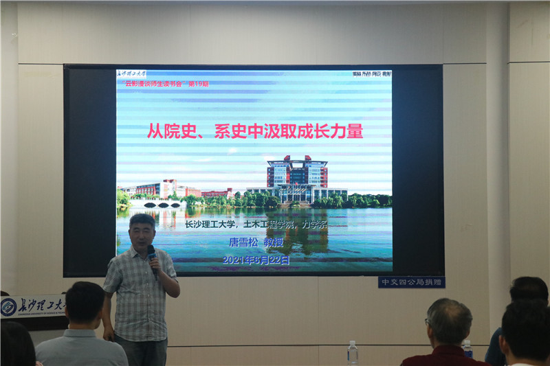 唐雪松老师以《从院史、系史中汲取成长力量》为题,结合自身经历,生动讲述了土木学院和工程力学专业发展历程,他指出学校、学院和专业的发展是在国家发展强大的大背景下,饱含着一代又一代土木师生不懈奋斗的深情,同学们要学好院史、系史,在历史的感悟与比较中珍惜当下,承担新时代赋予的使命与责任。
