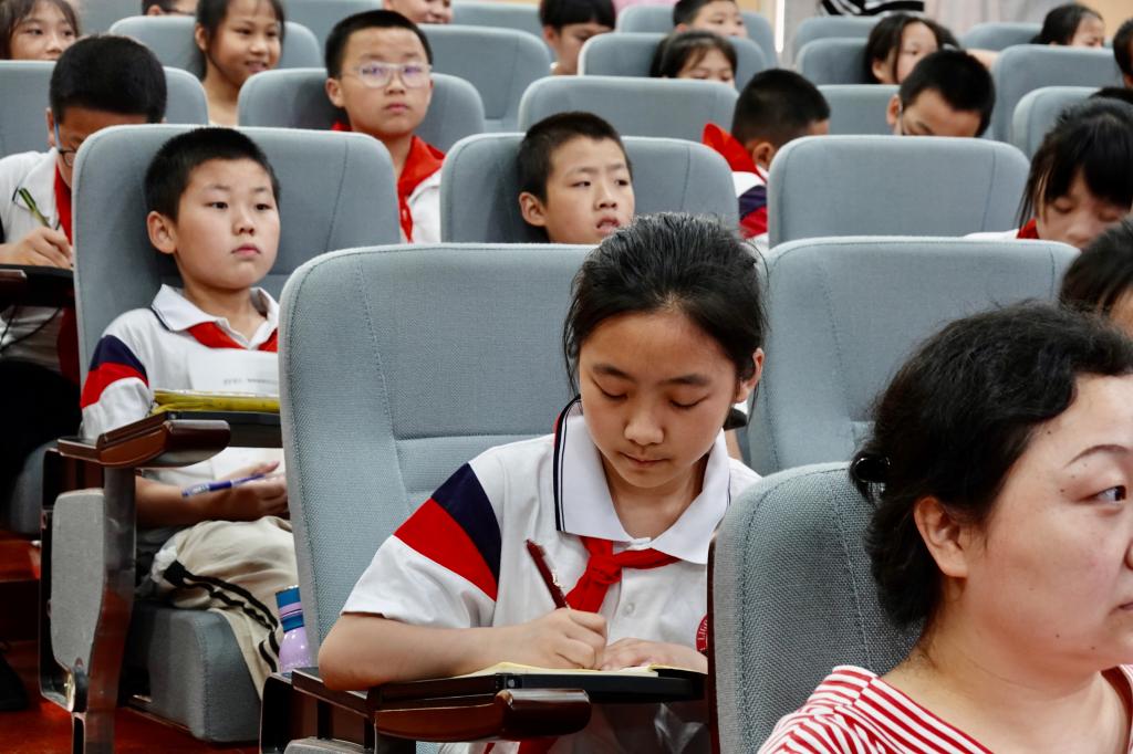 同学们认真聆听,写满了整页的笔记。五年级一班的杨雨霓同学分享了自己的体会,“毛主席认为那个时候中国人除了肚子上的饥饿,精神上也是非常匮乏的,所以他就带领工人们读书,建立了书会,我们现在的生活变好了,更应该努力学习,报效祖国。”