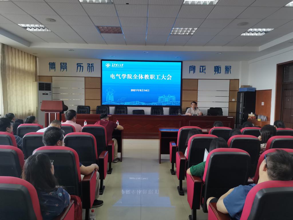 9月14日下午,电气学院在工一B503召开2021年度秋季学期第一次全体教职工大会,学习传达学校新学期第一次党政工作(扩大)会议精神,对本学期工作进行部署和动员。会议由院党委书记符慧林主持,全体教职工参加。