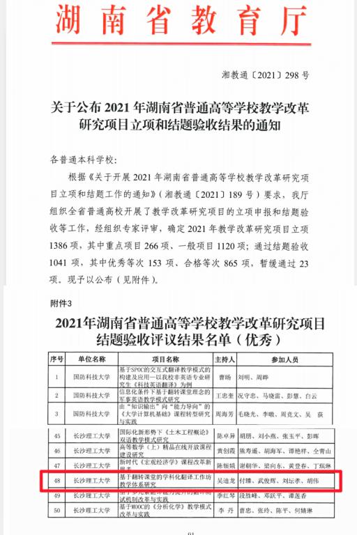 近日,湖南省教育厅发文(湘教通[2021]298号)公布了2021年省级教学改革研究项目结题名单,共1041项通过结题验收,其中优秀等次153项,优秀率14.7%。我院吴迪龙教授主持的“基于翻转课堂的学科化翻译工作坊教学体系研究”教学改革项目顺利结题,并获评优秀等次,这是我院继2017年陈瑜教授主持的“3+1中外合作办学项目工科人才培养模式的实践与创新”省级教改项目结题获评优秀等次后的又一次突破。