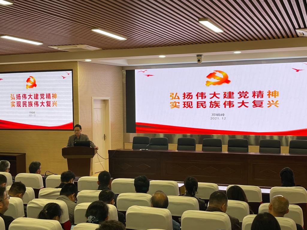 邓崛峰从十九届六中全会作出的《中共中央关于党的百年奋斗重大成就和历史决议》中党中央号召“全党全军全国各族人民要更加紧密地团结在以习近平同志为核心的党中央周围,全面贯彻习近平新时代中国特色社会主义思想,大力弘扬伟大建党精神,勿忘昨天的苦难辉煌,无愧今天的使命担当,不负明天的伟大梦想,以史为鉴、开创未来,埋头苦干、勇毅前行,为实现第二个百年奋斗目标、实现中华民族伟大复兴的中国梦而不懈奋斗”入题,从习近平总书记在庆祝中国共产党成立100周年大会上的重要讲话中深刻论述的伟大建党精神,从伟大建党精神的形成条件、深刻内涵、与中国共产党人精神谱系的关系、新时代如何弘扬等四个方面进行讲解。